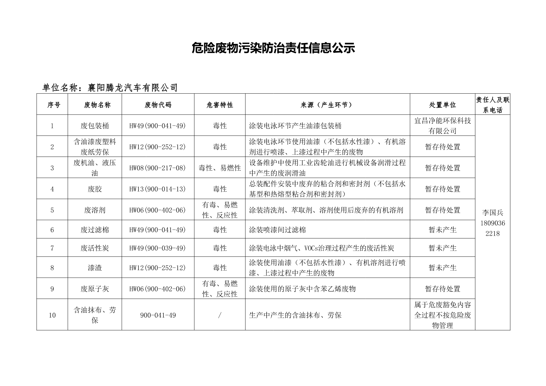 Public Notice of Tenglong Automobile's Responsibility for Preventing and Controlling Hazardous Waste Pollution